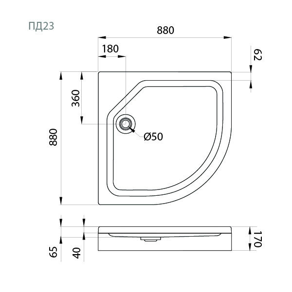 ПД23 Поддон Душевая кабина 1/4 круга низкий 88х88